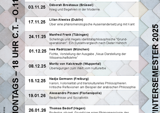 Das Ankommen im Fach beginnt mit der Welcome Week, die vom 13. bis 17.10. stattfinden wird. Für das Fach Philosophie sind folgende Termine für Sie relevant: